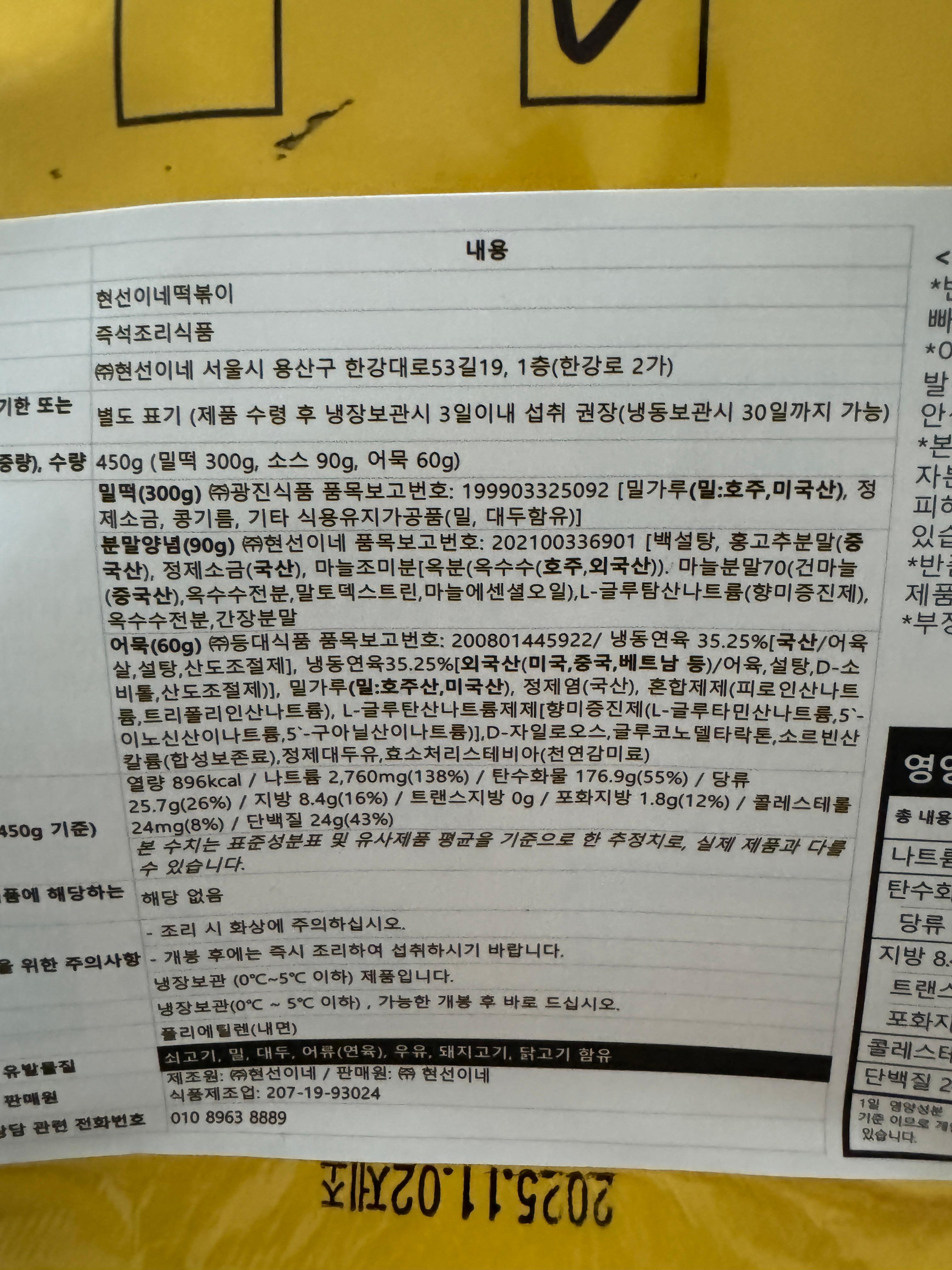 냉장용 떡이라 떡의 식감은 좀 변할 수 있다고 한다.