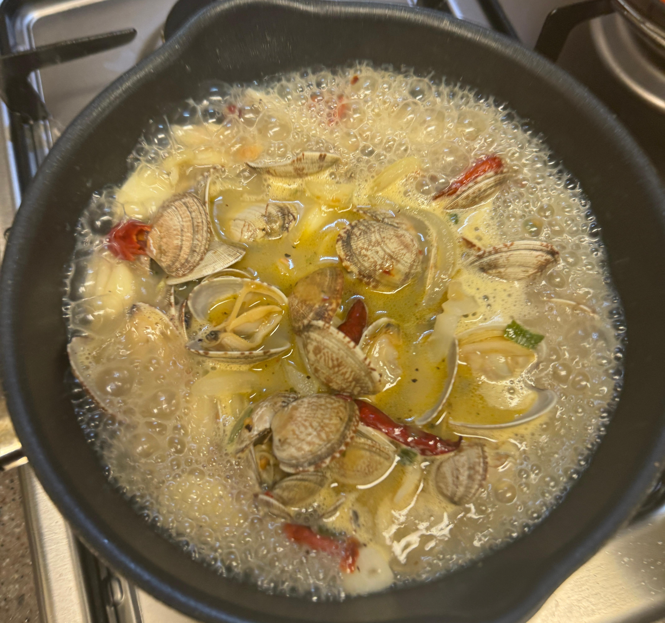 특히 바지락이랑 스파게티 면을 잘 해동시켜야 한다.