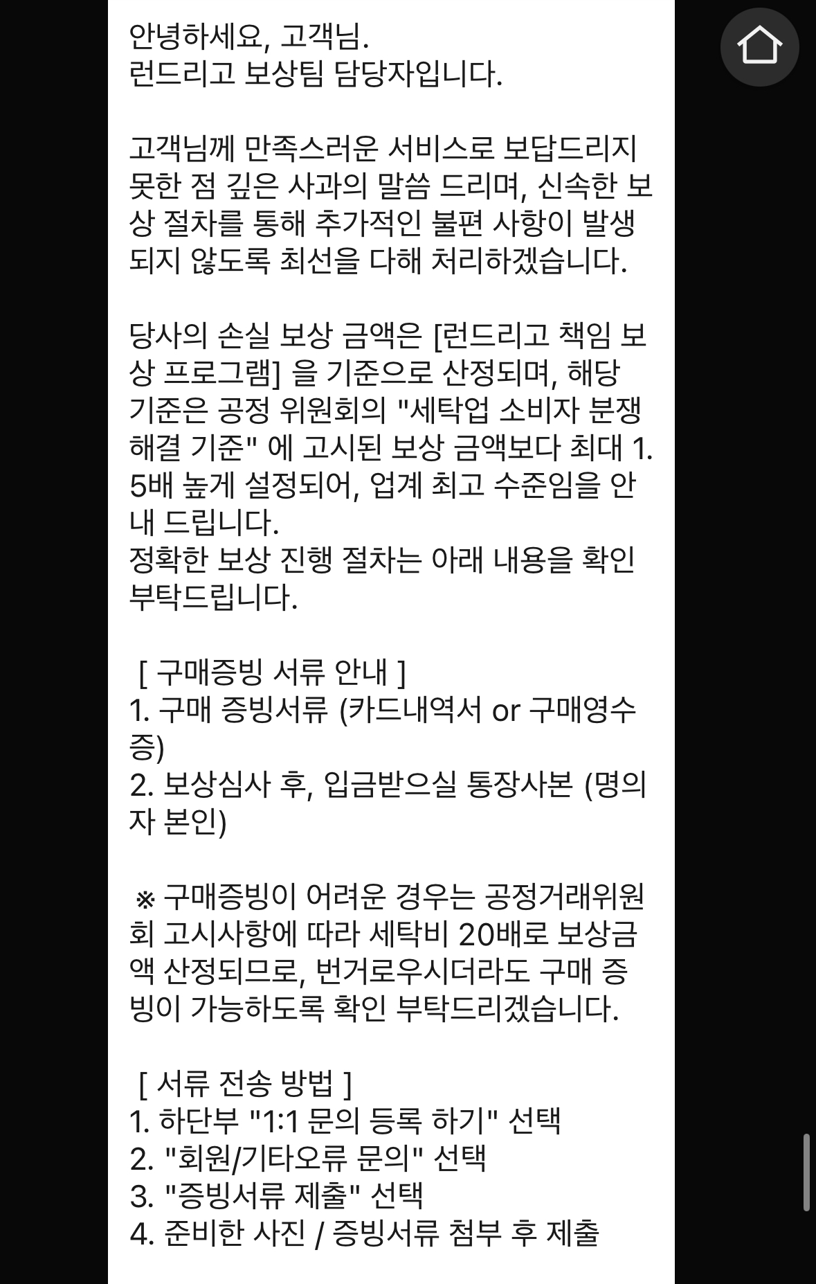 런드리고가 직접 보상금을 지급하는 게 아니라, 실제 세탁을 진행한 업체가 해당 제품을 '구매'하는 방식으로 보상이 진행된다는 것이었어요.