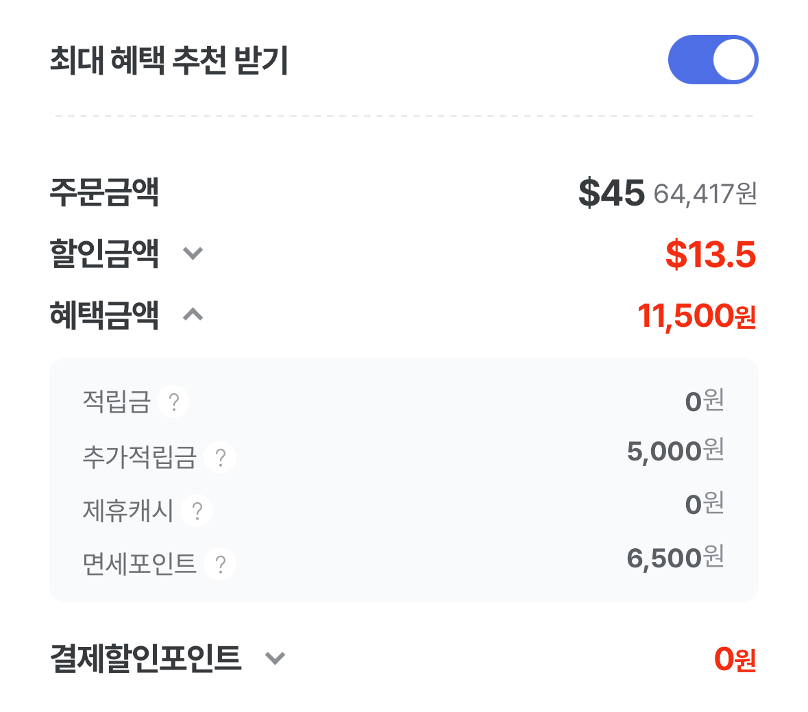 최대 혜택 추천 받기를 체크하면 혜택금액 하위에 면세포인트 사용이 가능하면 금액이 표시가 된다.
